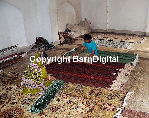 Workers in a hand made carpet cooperative in Jaipur finish carpets by binding the edges and adding tassels to the ends. Jaipur, Rajasthan, Republic of India. 11 December 2008