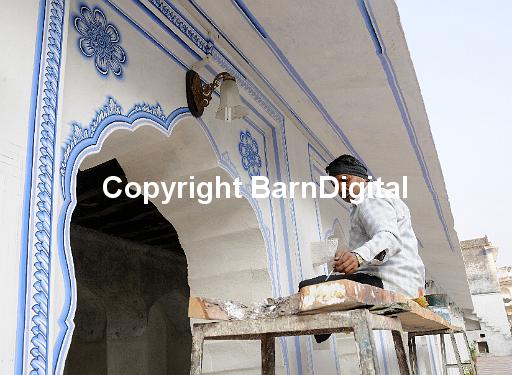A skilled painter decorates the white walls of a colonnade with traditional blue repeating patterns. This is part of an old palace that has been restored as a hotel. Nimaj, Rajasthan, Republic of India. 13 December 2008