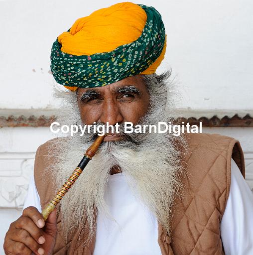 A roguish man with long grey whiskers, beard and moustache and an orange turban poses for tourists in the Mehrangarh. He is pretending to smoke a A roguish man with long grey whiskers, beard and moustache and an orange turban poses for tourists in the Meherangarh, the maharaja of Jodhpur's Majestic Fort. He is pretending to smoke a water pipe. Jodhpur, Rajasthan, Republic of India. 13 December 2008