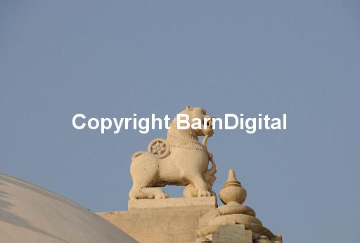 A marble lion, one of four one on the domed roof of the Chaumukha Temple, the main temple in the complex of Jain temples at Ranakpur. Ranakpur, Rajasthan, Republic of India. 14 December 2008