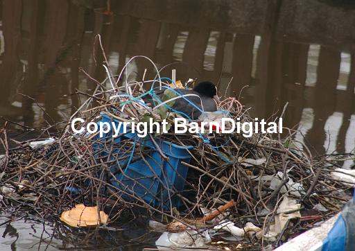 A coot (Fulica atra) sits on its nest made from rubbish including a blue plastic milk crate on an Amsterdam canal. Amsterdam, Holland. 23 April 2006.