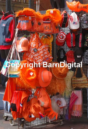 Brightly coloured toutist hats and bags and inflatable clogs. Amsterdam, Holland. 24 April 2006