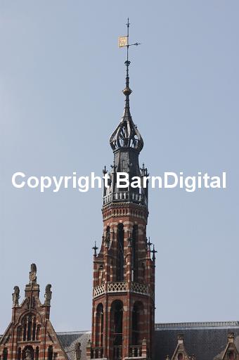 Fanciful, ornate, gothic, spire of Magna Plaza. This used to be the post office building, Postkantoor opened in 1899, but it has been restored as a shopping centre. Amsterdam, Holland. 24 April 2006.