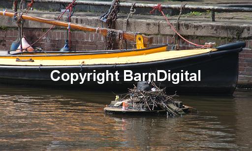 A coot (Fulica atra) sits on its nest lined with rubbish on a purpose built raft beside a sailing boat on an Amsterdam canal. Amsterdam, Holland. 23 April 2006.