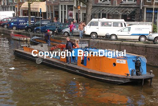 Amsterdam barge Barn Digital BarnDigital blue boat canal collect communications cruise garbage landfill Michael Grant MIchaelGrantImages Nederland net Netherlands orange port recycle river rubbish ship transport transportation trash travel waste water