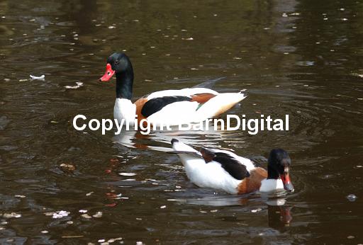 Male, drake, shelduck duck (Tadorna tadorna) with red knobbed bill and female, duck, in the foreground. Keukenhof Gardens, Holland. 25 April 2006