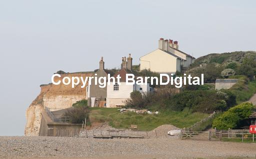Old coast guard cottages at the mouth of the Cuckmere River. The cottages are protected form the sea by a concrete sea wall and the end of the chalk cliffs. The tertiary sands are clearly seen overlying the chalk. Cuckmere Haven, Sussex, UK. 04 June 2005.