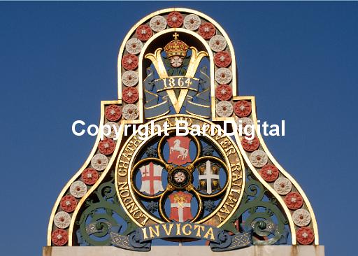 The ornate and grandiose arms of the long defunct London, Chatham and Dover Railway dominate the southern end on the now dismantled Blackfriars railway bridge across the River Thames to Blackfriars in the City of London. The bridge, also known as the Alexandria Railway Bridge and the St Paul's Railway Bridge was partially dismantled in 1984. The arms of Dover , Chatham, Kent and the City of London are incorporated together with 'Invicta', unconquered, the motto of Kent, V for Queen Victoria and the date 1864 with a crown and roses. Southwark, London, UK. 06 June 2006.
