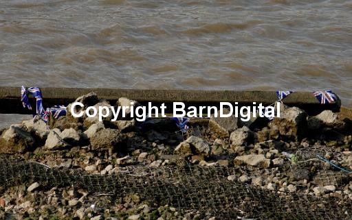 bank Barn Digital BarnDigital Bridge buildings bunting discarded disrepect embankment England Great Britain journey London Michael Grant MIchaelGrantImages mud red white blue River south bank stone street Thames thrown away town travel UK union flag union jack United Kingdom urban water