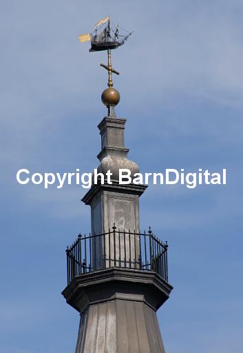 Top of the spire showing the gilded sailing ship weather vane of the Church of St Nicholas Cole Abbey. Queen Victoria Street EC4. City of London, UK. 28 June 2006