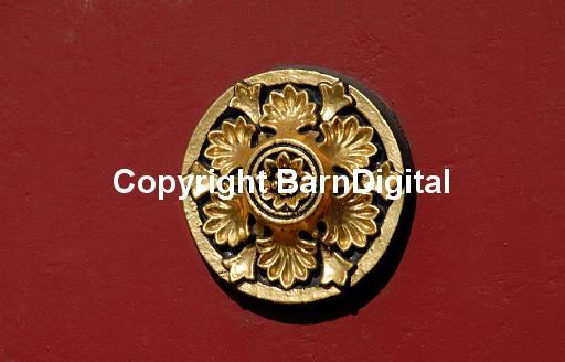 Ornamental gilt boss on the ironwork of Blackfriars Bridge. The bridge was completed in 1869 to a design by Joseph Cubitt. City of London, UK. 28 June 2006