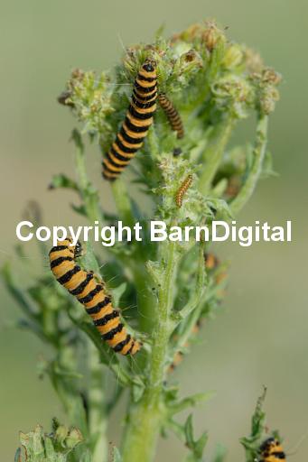 Yellow and black caterpillars, lava, of the Cinnabar Moth (Tyria jacobaeae) feeding on the flower buds and new leaves of Common Ragwort (Senecio jacobaea). The warning colouration, long hairs, poisons and unpleasant taste from eating ragwort, allow these caterpillars to feed in the open on the tender tips of the plants without being molested by birds. Cuckmere Haven, Sussex, UK. 03 July 2006.