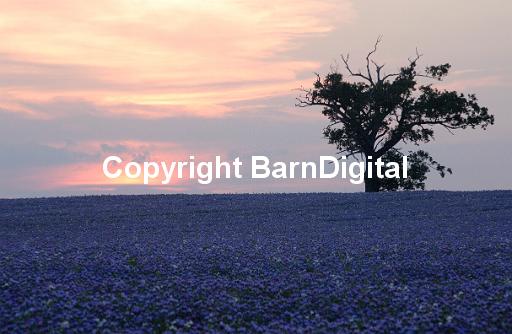An oak tree (Quercus robur) grows in a field of the blue flowers of bugloss (Echium species). Bugloss is a new crop in the UK and is grown for the oil obtained from its seeds. Sissinghurst, Kent, England, UK. 04 July 2006.
