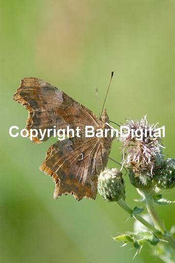 A comma butterfly (Polygonia c-album, Nymphalis c-album) with its wings closed feeds on a creeping thistle (Cirsium arvense). Harrison's Rocks, Groombridge, Kent. UK. 12 July 2006.