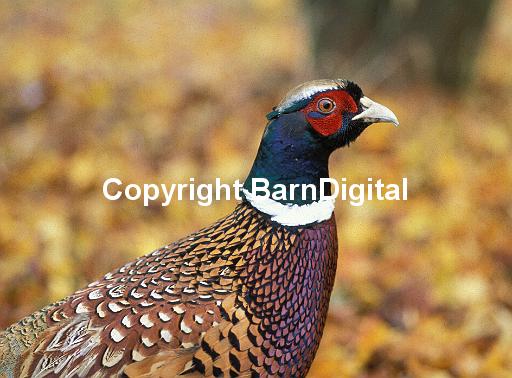 A cock pheasant (Phasianus colchicus), resplendent in new plumage, poses against autumnal maple leaves. This has typical coloration but they are very variable due to stock introduced for shooting. Bedgebury Forest, Kent. UK. November 2002