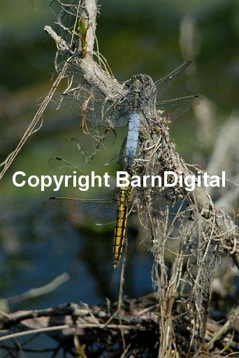 A blue dragonfly, a male Black-tailed Skimmer (Orthetrum cancellatum), grasps the dull yellow brown female in preparation for mating. On the banks of the slow flowing River Stour. Stodmarsh National Nature Reserve, Upstreet, Kent, England, UK. 19 July 2006.