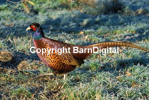 A cock pheasant (Phasianus colchicus), resplendent in new plumage against a frosty background. Coloration is very variable due to stock introduced for shooting. This one lacks the white neck ring. Bedgebury Forest, Kent. UK. January 2003.