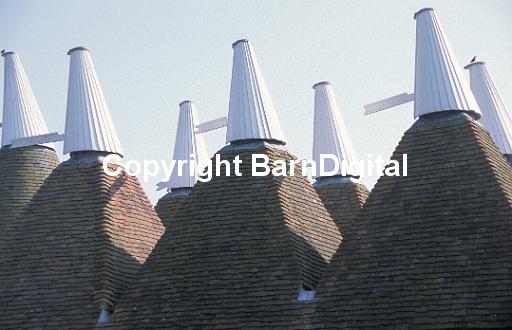 A group of seven oast house roofs. These have square roofs, more modern than the traditonal round ones. All have traditional Kent peg tile roofs and the traditional white cowls. Oast houses were used for drying hops by drawing air through layers of hops; effectively they are chimneys and the cowls, which rotate according to the wind direction maximise the draught. Oasts are a common sight in Kent although most have now been converted into dwelling houses. Sissinghurst, Kent, UK. August 2003.