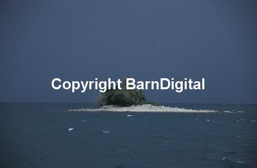 A tiny island near between Isola Bella and Isola Superiore dei Pescatori in Lake Maggiore sunlight against black sky and water as a storm sweeps over the lake. Lake Maggiore. Italy August 2004.