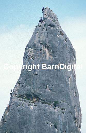 This dramatic limestone pillar, Aguglia di Goloritzè, is one of the clasic climbs on Sardina. It towers above the beach at Cala Goloritze and is at the end of a long and dramatic limestone gorge. This is the West side of the Aguglia and a climber can be seen near the top. Cala Goloritze, Carla Gonone Sardinia. September 2004.