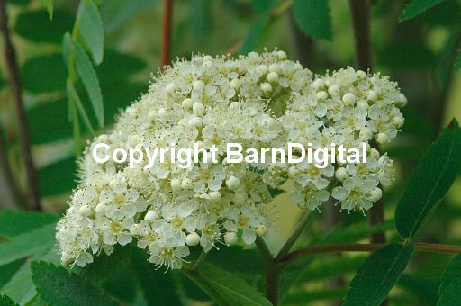 Rowan or Mountain Ash (Sorbus aucuparia) flowers. These small trees with their red berries privide protection against witches and evil. Bedgebury Forest, Kent, UK. 09 May 2004.
