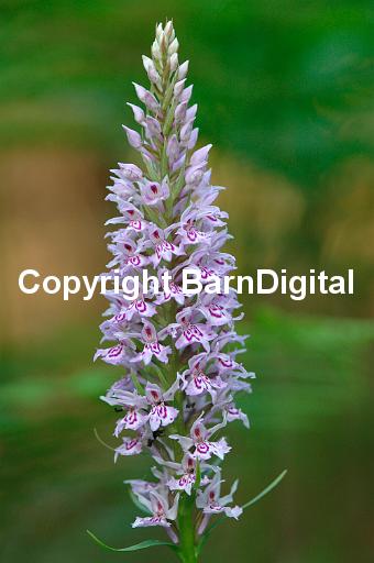 Flower spike of Common Spotted Orchid (Dactylorhiza fuchsii). These flowers are very variable in colour, ranging from white to dark lilac, shape of spike and size. Bedgebury Forest, Kent, UK. 13 June 2004.