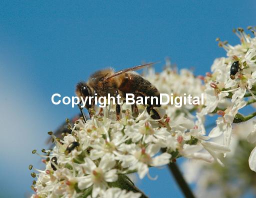 science nature nectar white flight flower insect insecta proboscis compound bright summer honey brown Hymenoptera Apocrita Umbelliferae carrot family plant botany weed green flower pollen blossom anther filament stigma style pistil male female colour color wildlife wild life closeup close up BarnDigital Barn Digital Michael Grant