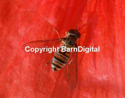Hoverfly on poppy petal (Papaver rhoeas) Bedgebury Forest, Kent, UK. 17 July 2004.