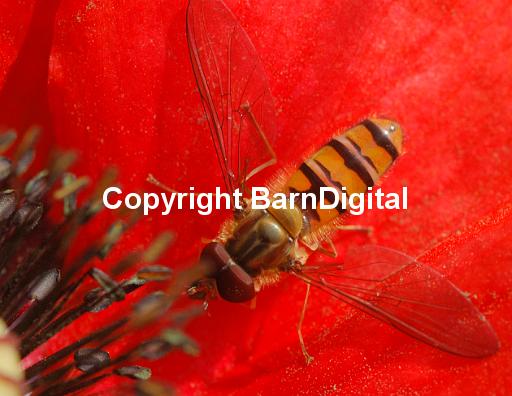 fly plant botany flower pollen blossom anther filament stigma style pistil petal male female colour color summer orange Syrphidae Diptera true fly insect insecta compound eye papaveraceae science nature wildlife wild life closeup close up BarnDigital Barn Digital Michael Grant