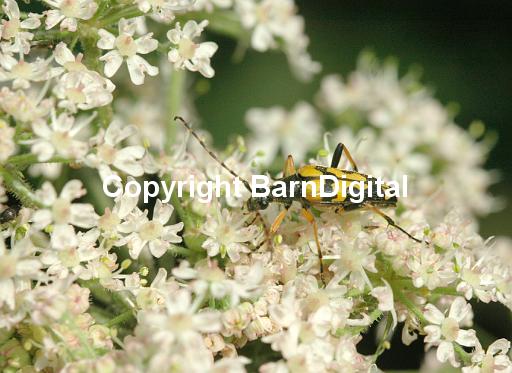 A black and yellow Longhorn Beetle (Strangalia species) forages on a hogweed flower ((Heracleum sphondylium). Bedgebury Forest, Kent, UK. 17 July 2004.