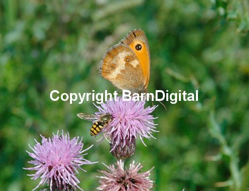 A Gatekeeper butterfly (Maniola tithonius) feeding on brown knapweed (Centaurea jacea) is joined by a hoverfly. Bedgebury Forest, Kent, UK. 24 July 2004.