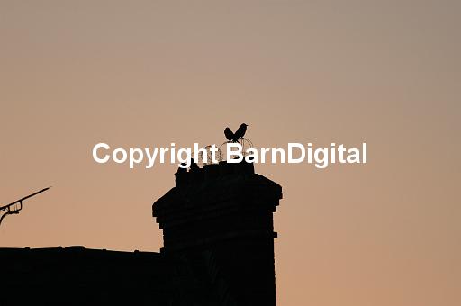 Jackdaws (Corvus monedula) sit on a chimney silhouetted against the evening sky. Pett Level, Sussex, UK. 25 March 2005.