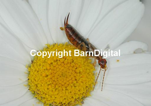insect insecta bug beetle Dermaptera Forficulidae science nature plant botany weed flower pollen blossom anther filament stigma style male female spring white yellow herb herbaceous plant Compositae open science nature wildlife wild life closeup close up BarnDigital Barn Digital Michael Grant