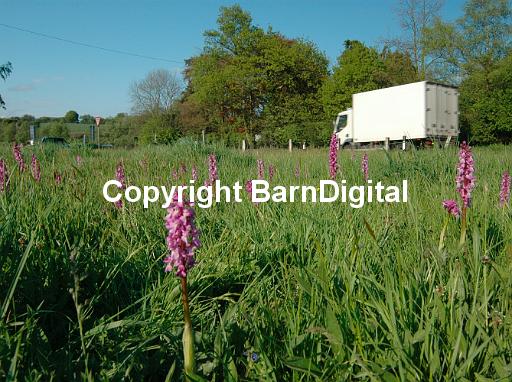 Roadside verges can be a haven for wildlife now that spraying with weedkiller is out of favour. Here Early Purple Orchids (Orchis mascula) grow within a few feet of the traffic. Bedgebury Forest, Kent, UK 02 May 2005