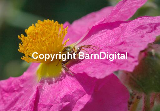 spider arachnid araneae hunt lurk prey trap predator yellow pink magenta bright rock-rose family cistaceae flower pollen pollination blossom nectar anther filament stigma style pistil wildlife wild life closeup close up BarnDigital Barn Digital Michael Grant