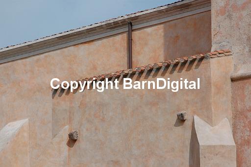 The pink plastered walls and terra cotta roof tiles of the fourteenth century Chiesa di (church of) Santa Maria in Oliena. Oliena, Sardinia. Italy. 13 May 2005.