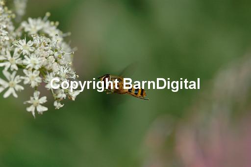 A black and orange hoverfly comes in to land on a hogweed (Heracleum sphondylium) in order to feed on the nectar secreted by the flowers. Bedgebury Forest, Kent, UK. 17 July 2005.