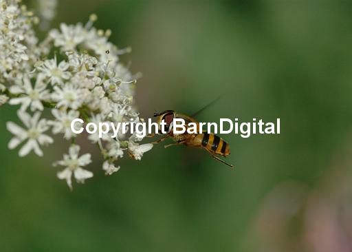 A black and orange hoverfly comes in to land on a hogweed (Heracleum sphondylium) in order to feed on the nectar secreted by the flowers. Bedgebury Forest, Kent, UK. 17 July 2005.
