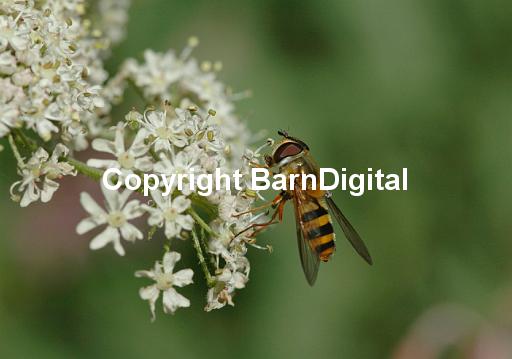 Syrphidae Diptera two-winged fly true fly insect insecta science nature wildlife wild life summer nectar white flight fly flower insect insecta Umbelliferae carrot family plant botany weed green flower pollen pollination blossom nectar anther filament stigma style pistil male female herb herbaceous plant closeup close up BarnDigital Barn Digital Michael Grant
