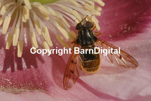 Papaver somniferum pink poppy family papaveraceae plant botany flower pollen blossom anther filament stigma style pistil petal male female seed pollen pollination nectar black yellow orange mimic Batesian mimicry feed Syrphidae Diptera true fly hover insect insecta compound eye science nature wildlife wild life closeup close up BarnDigital Barn Digital Michael Grant
