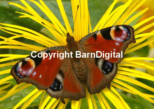 blue red yellow Peacock Nymphalis io Nymphalidae spread wings eyes butterfly nectar pollen pollenation colour fly flight flower Lepidoptera Nymphalidae insect insecta proboscis scale compound eye bright summer daisy family compositae yellow red science nature wildlife wild life closeup close up BarnDigital Barn Digital Michael Grant