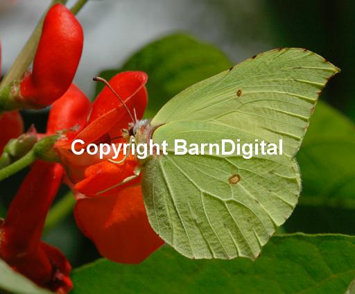 brimstone butterfly Gonepteryx rhamni nectar pollen colour color fly flight flower feed food insect insecta bug Lepidoptera Pieridae proboscis scale compound bright summer green yellow red flower bean pea family Leguminosae science nature wildlife wild life closeup close up BarnDigital Barn Digital Michael Grant