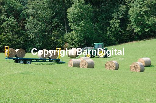 Rolled bales of hay being loaded onto a trailer by a tractor with a fork lift attachment. Bedgebury Forest, Kent, UK. 21 August 2005.