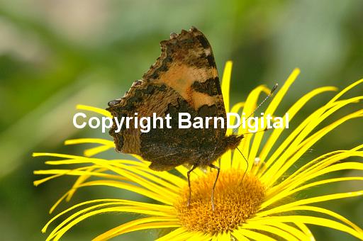 butterfly nectar pollen pollenation colour fly flight flower Lepidoptera Nymphalidae insect insecta proboscis scale compound eye bright summer daisy family compositae yellow red science nature wildlife wild life closeup close up BarnDigital Barn Digital Michael Grant