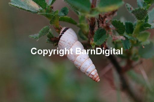 Elongated white snail with a black rim round the shell on vegitation in sand dunes. Pegwell Bay, Ramsgate, Kent. UK. 09 September 2005.