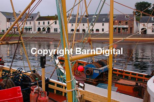 Fishing boats tied up to the pier in Ullapool harbour, Loch Broom , the white painted houses of West Shore Street in the background, on a cloudy autumn morning. Ullapool, Ross-shire, Scotland, UK. 03 October 2005