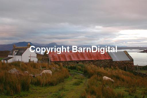 loch sea water peat bog farm croft sheep wool building house material stone white slate corrugated iron red rust highlands Loch Broom grass rush sedge morning gloom cloud travel BarnDigital Barn Digital Michael Grant