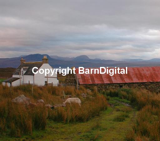 loch sea water peat bog farm croft sheep wool building house material stone white slate corrugated iron red rust highlands Loch Broom grass rush sedge morning gloom cloud travel BarnDigital Barn Digital Michael Grant