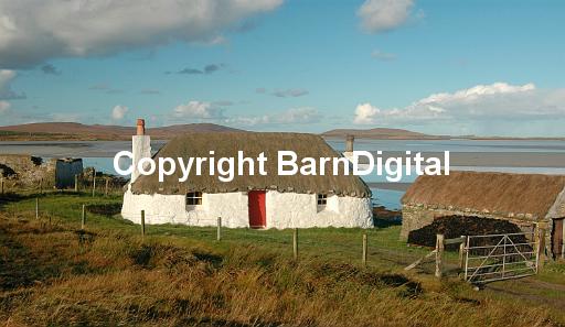 fuel sustainable black house building construction tradition house farm croft stone thatch white black house beach sea shore mud flats salt flats sand machair subsistance grazing sheep field hay grass Atlantic Ocean Outer Hebrides Western Isles island travel BarnDigital Barn Digital Michael Grant