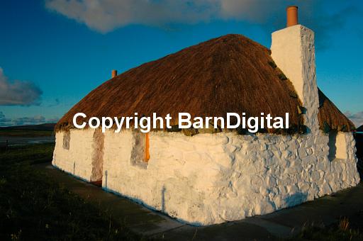 black house building construction tradition house farm croft stone thatch white black house beach sea shore mud flats salt flats sand machair subsistance grazing sheep field hay grass Atlantic Ocean Outer Hebrides Western Isles island travel BarnDigital Barn Digital Michael Grant